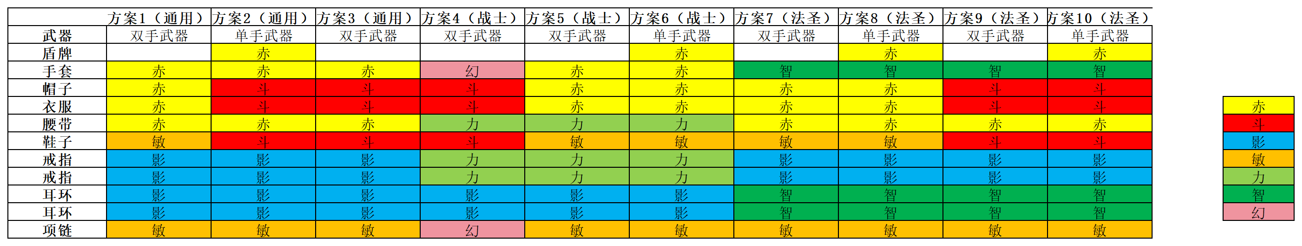 配装思路:4赤+3力+2敏+2影 适用战士职业。对比方案五,把双手武器换成了单手武器加赤盾,单手武器加成的攻击效果略低于双手武器,但盾的存在大幅增加了生存能力,也能够争取一定的输出空间,不失为一种很好的选择。 以上是本期的配装分享,如果你有更好的搭配思路,欢迎前往论坛分享你的独到见解!下一期,我们将聚焦魔导士与圣职者,带来他们的详细属性数值展示,敬请期待哦!