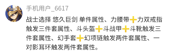 适用魔导士/圣职者。跟上述方案3对比,把双手武器换成了单手武器+赤盾,效果同上述,大幅增加坦度,并多激活一条赤套装属性,弥补PVE输出以及生存能力。适用迷宫乱斗、屠魔战场等PVEPVP结合性玩法。 玩家分享此外,还有许多热心玩家分享了自己了装备搭配思路。英雄装的组合方式丰富多样,每种类型都能展现出独特优势。让我们一起来看看他们有哪些好点子吧!
