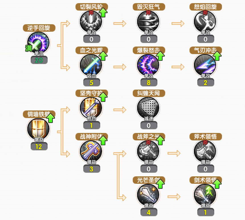 大神建议大神语录:龟龟 这套加点方案的核心在于生存能力:坚壳守护点满后可提供39%的格挡几率,有效抵挡伤害,再配合铜墙铁壁和战斧之光带来大量额外防御,显著提升了PVP对抗和越级挑战BOSS时的生存几率。 不过,该配置也存在明显缺点:一是输出技能等级偏低,难以打出高额伤害;二是Buff类技能较多,挤占了一个输出技能栏位,导致技能循环不顺畅,有时甚至需依赖普攻衔接。个人推荐优先点满逆手回旋,再将毁灭狂气和怒焰回旋都升至11级。在PK方面,由于技能槽数量限制,无法携带减速技能,容易被法师放风筝,若技能槽能扩充至10个,体验会顺畅许多。 方案四伤害均衡,伤害技能保持共进,副点Buff技能。