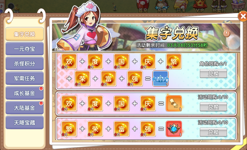 活动期间,挑战精英/首领怪物可掉落“文字道具”(每日上限100个)。 文字道具可兑换「称号·山河守护者」、「保护卷轴」、「英雄徽章」、「宝石随机箱」等丰厚奖励。 一元夺宝
